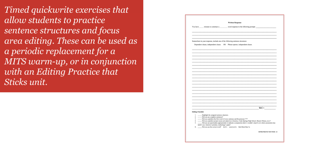 Welcome to Editing Practice that Sticks, a new series of exercises for helping students to understand the principles and conventions sound writing and apply that understanding to self- and peer-editing work. Just like the bestselling Mechanics Instruction that Sticks series, this product uses learning science principles to help students master and apply writing knowledge without overstressing them or you.