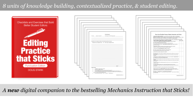 Perhaps the best way to understand what Editing Practice that Sticks offers is to take a look at author Doug Stark's "Eight Tips for Using Editing Practice that Sticks." These tips give you a glimpse into the pragmatic, clear-thinking mind of a teacher who has guided thousands of students in his career to clearer, sounder writing and editing. You can read that tips article, for free, right here.